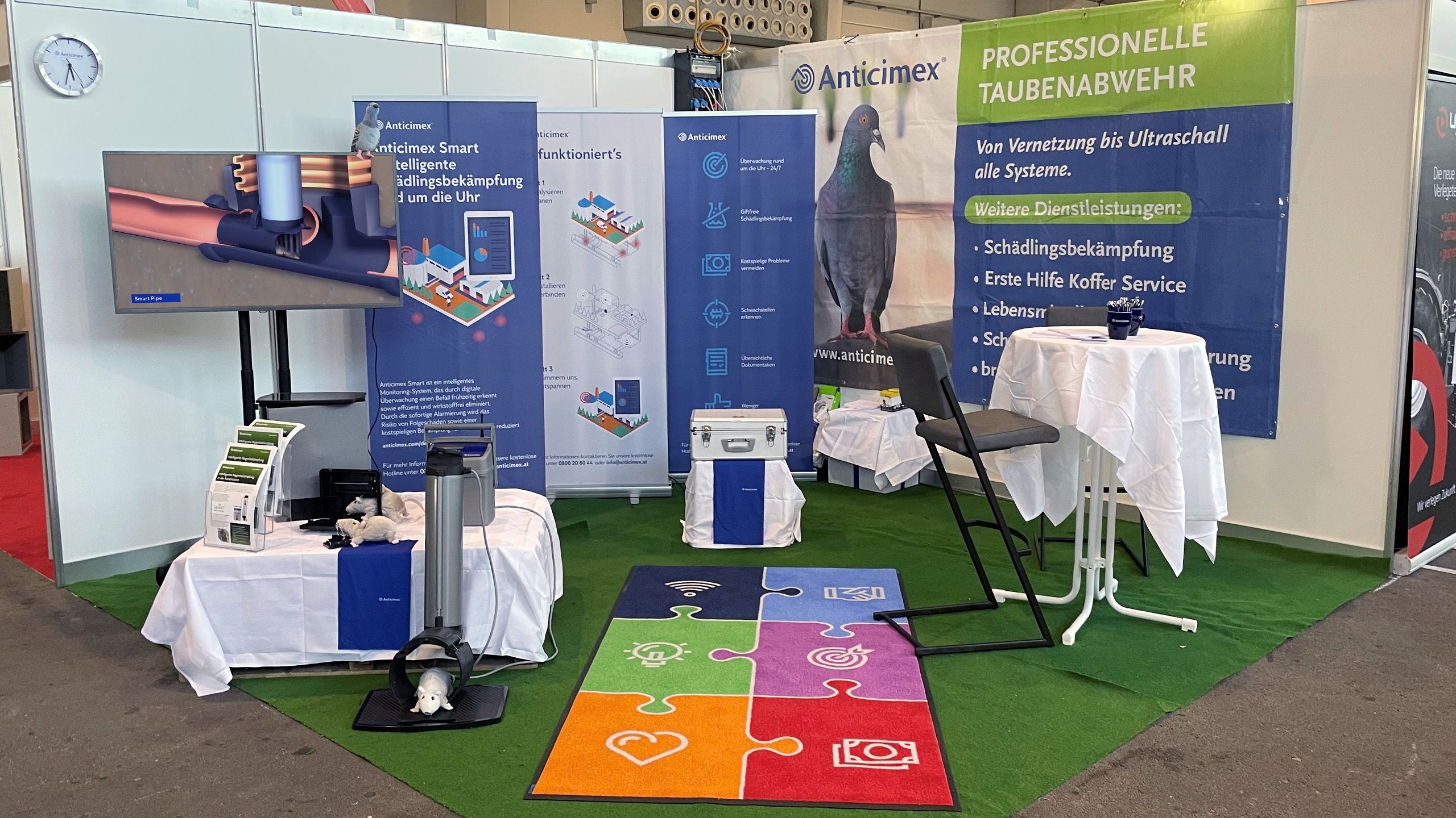Zwischen dem 15. und 16. September 2021 konnten die Besucher der Kommunalmesse in Tulln die innovativen und völlig giftfreien Produkte aus der Anticimex SMART-Reihe näher kennenlernen. Ganz im Zeichen der Kommunalmesse war natürlich die SMART Pipe das Highlight der Besucher. Dieses weltweit einzigartige System liefert alle relevanten Daten in Echtzeit wo, wann und wie viele Schädlinge getilgt wurden. Die SMART Pipe hat mehrere Sensoren verbaut, um nicht nur Fehlschüsse zu vermeiden, sondern auch um die Ratten tierschutzgerecht zu eliminieren. Die Kunststoffbolzen werden nach dem erfolgten Schuss selbstständig wieder in die Ausgangsposition bewegt und sind innerhalb kürzester Zeit wieder einsatzbereit. Besonders beeindruckt hat die Gäste natürlich die Demonstration der Schüsse auf Plüschratten. Vor allem die Geschwindigkeit der Bolzen beim Schuss und ohne das Kanalrohr zu berühren, zeugte von der Präzision mit der die SMART-Produkte arbeiten. Die zahlreichen Rückmeldungen sowie bereits konkrete Anfragen von Gemeinden sind Beweis genug, dass Umweltschutz und Nachhaltigkeit auch in der Schädlingsbekämpfung zukünftig ernst genommen wird. Obwohl auch zukünftig mehrere Ausstellungen auf Messen geplant sind, ist es selbstverständlich möglich, jederzeit die Funktionsweise vor Ort demonstriert zu bekommen bzw. eine Bedarfsanalyse mit anschließendem Angebot zu erhalten.